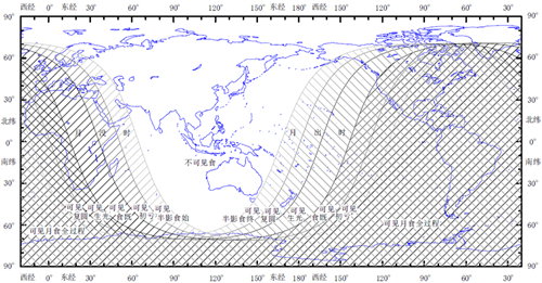 見(jiàn)食地區(qū):這次月食,在太平洋(除西北部)、大洋洲東部、北美洲南部、南美洲、大西洋、歐洲西南部、非洲、亞洲極西南部、印度洋西南部、南極洲可以看到。