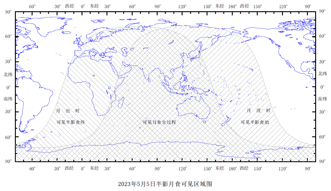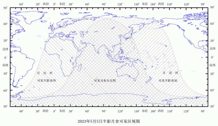 見食地區(qū):這次月食,在歐洲(除極西部和極北部)、非洲、大西洋東南部、亞洲(除極北部和極東部)、印度洋、大洋洲、太平洋西部、南極洲可以看到。