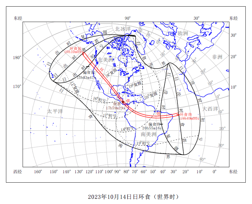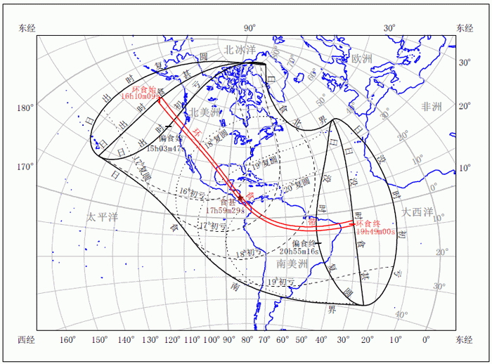 見(jiàn)食地區(qū):這次日食,環(huán)食帶從太平洋東北部開(kāi)始,經(jīng)過(guò)美國(guó)、墨西哥、伯利茲、洪都拉斯、尼加拉瓜、巴拿馬、哥倫比亞、巴西,在大西洋西部結(jié)束。在北美洲(除極西部和極東北部)、南美洲(除南部)、太平洋東部、大西洋(除北部和東南部)、非洲極西部可以看到偏食。