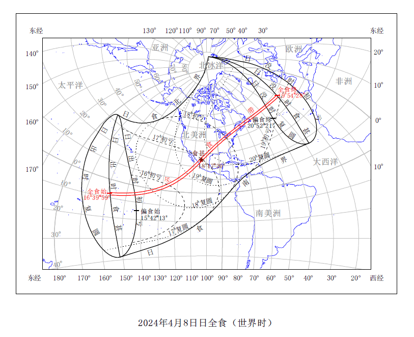 見食地區(qū):這次日食,全食帶從大洋洲東部開始,經(jīng)過太平洋東部、墨西哥、美國、加拿大極東南部,在大西洋西北部結(jié)束。在大洋洲東部、太平洋東部、北美洲(除極西部)、南美洲極西北端、大西洋北部、歐洲極西側(cè)、北冰洋部分區(qū)域可以看到偏食。