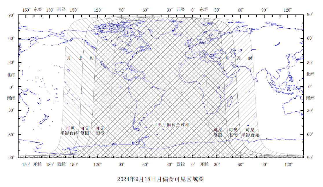 見食地區(qū):這次月食,在太平洋東部、北美洲(除極西部)、南美洲、大西洋、歐洲、非洲、亞洲西部、印度洋西部、南極洲部分區(qū)域可以看到。